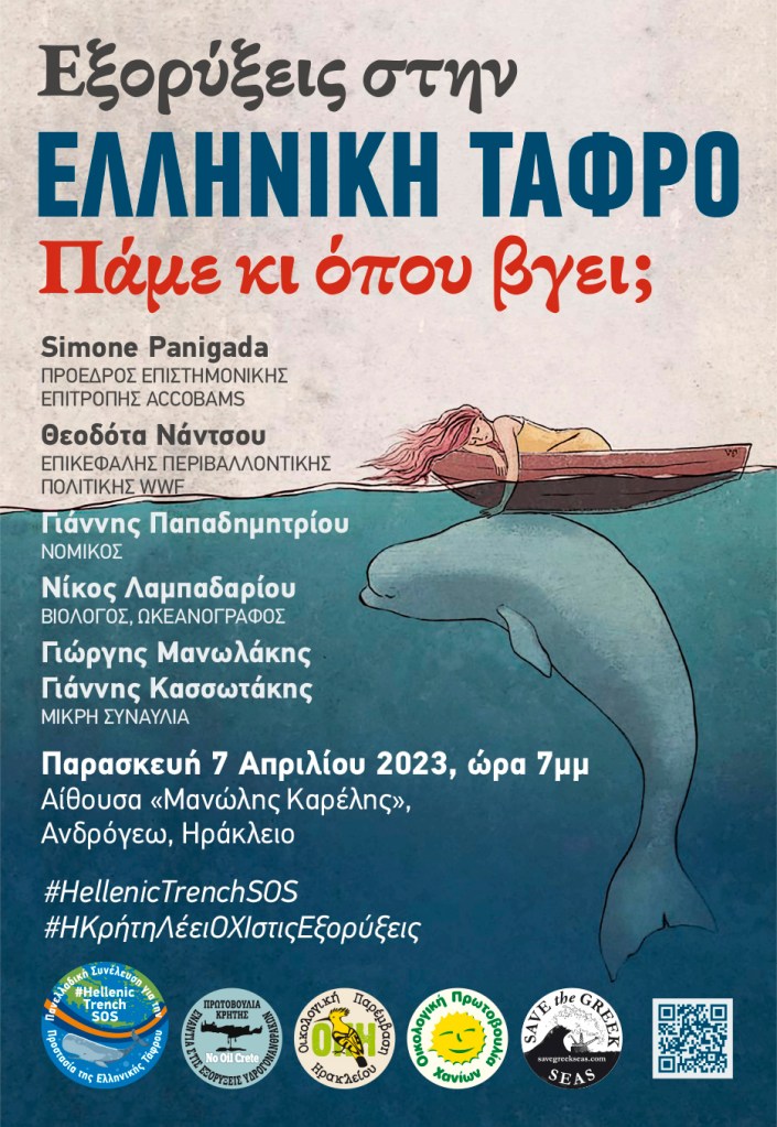 Εκδήλωση στο πλαίσιο της καμπάνιας για την προστασία της Ελληνικής Τάφρου θα γίνει την Παρασκευή 7 Απριλίου και ώρα 19:00 στην αίθουσα του Δήμου Ηρακλείου «Μανώλης Καρέλης» στην οδό Ανδρόγεω. Για το ζήτημα των εξορύξεων υδρογονανθράκων και την σημασία της Ελληνικής Τάφρου θα μιλήσουν ο Πρόεδρος της Επιστημονικής Επιτροπής της ACCOBAMS Simone Panigada, η Επικεφαλής Περιβαλλοντικής Πολιτικής του WWF Θεοδότα Νάντσου, ο νομικός Ιωάννης Παπαδημητρίου και ο Βιολόγος, Ωκεανογράφος, ερευνητής του ΕΛΚΕΘΕ Νίκος Λαμπαδάριου. Η εκδήλωση θα κλείσει με μικρή μουσική συναυλία με τον Γιώργη Μανωλάκη και τον Γιάννη Κασσωτάκη.